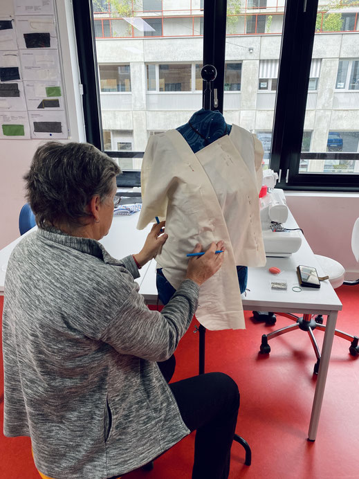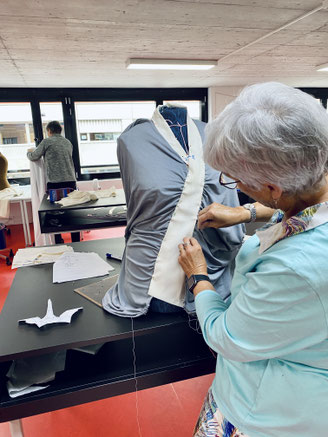 3. Auch ganz spannend: auf der Basis eines eigenes Grundschnittes wird eine Moulure genäht, auf welche neue spannende Modelllinien eingezeichnet werden, die Moulure wird an den neuen Linien verschnitten und anschliessend aus einem gewünschten Soff zusammengesetzt